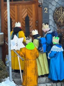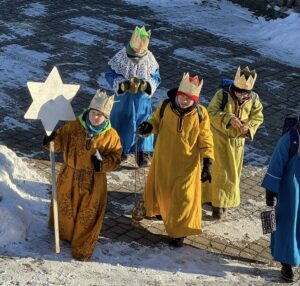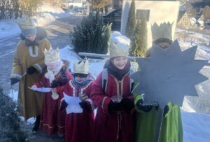 Bei strahlendem Sonnenschein, aber eisigen Temperaturen, fand heute die Sternsinger-Aktion 2026 statt. Trotz der Kälte machten sich 10 Kinder in 2 Gruppen als Sternsinger auf den Weg und zogen von Haus zu Haus um den Segen zu bringen und Spenden zu sammeln.
