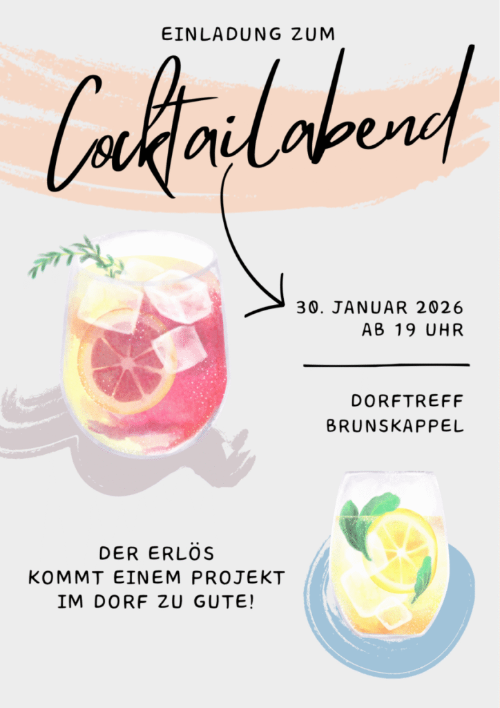 Am 30.01. findet wieder der beliebte Cocktailabend im Dorftreff statt. Start ist um 19 Uhr. Der Erlös kommt einem Projekt im Dorf zu Gute. Ideen dazu können noch entgegengenommen werden.