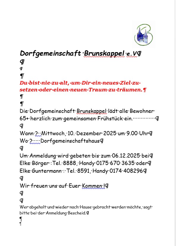 Der Dorfgemeinschaftsverein lädt wieder alle Senioren 65+ zu einem Frühstück ins Dorfgemeinschaftshaus ein.