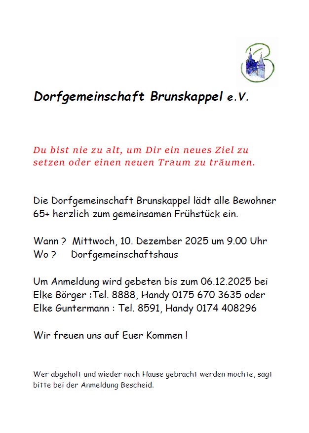 Der Dorfgemeinschaftsverein lädt wieder alle Senioren 65+ zu einem Frühstück ins Dorfgemeinschaftshaus ein.